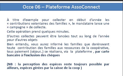 A la rentrée 2024, les comptes bancaires ouverts par l'OCCE06 pour les coopératives scolaires migreront sur le dispositif ASSOCONNECT (plateforme de collectes en ligne pour les parents/donateurs et banque en ligne).